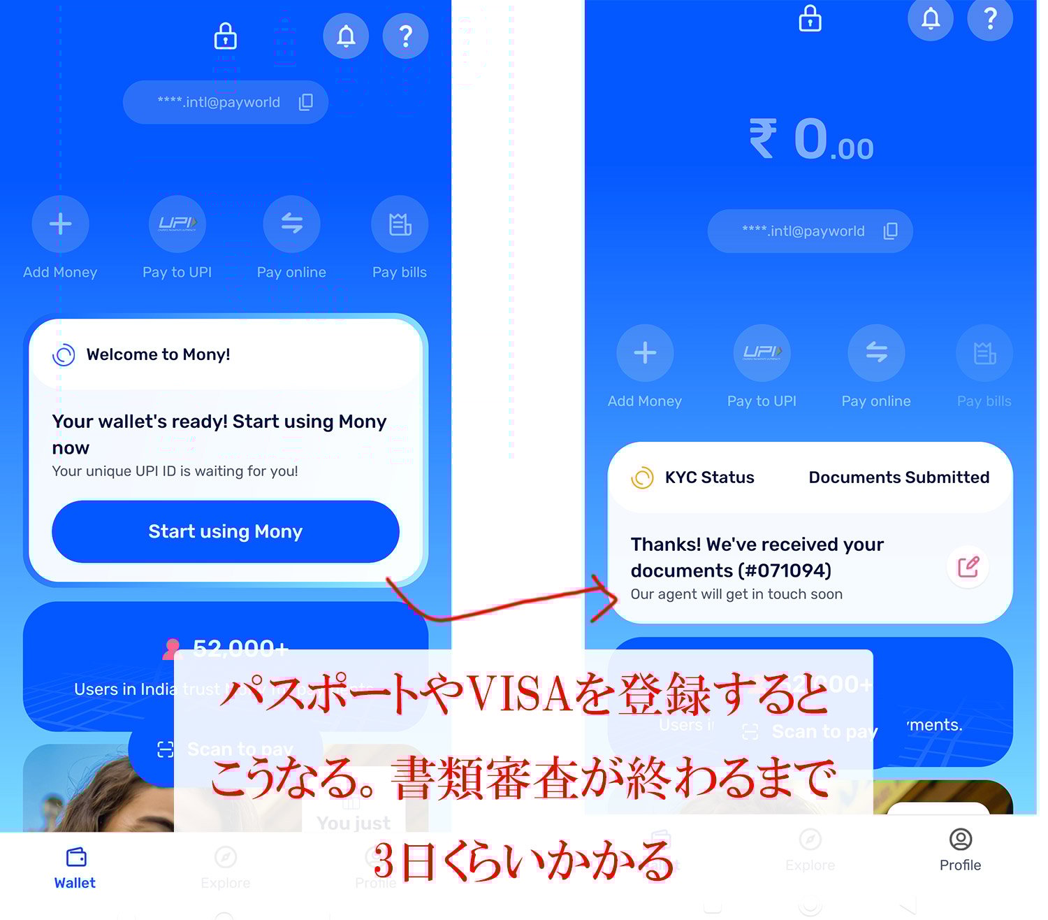 まず、インド国内からでないと登録ができません。インド到着後に始めて登録が開始できます。また、KYCチェック(お客様チェック)が入るので、登録してから実際に使えるようになるまで、3日程かかります。また、Mony内のインド人からWhat'sAppで確認の電話が入り、そこで答えられないと最後の使用許可がでません。