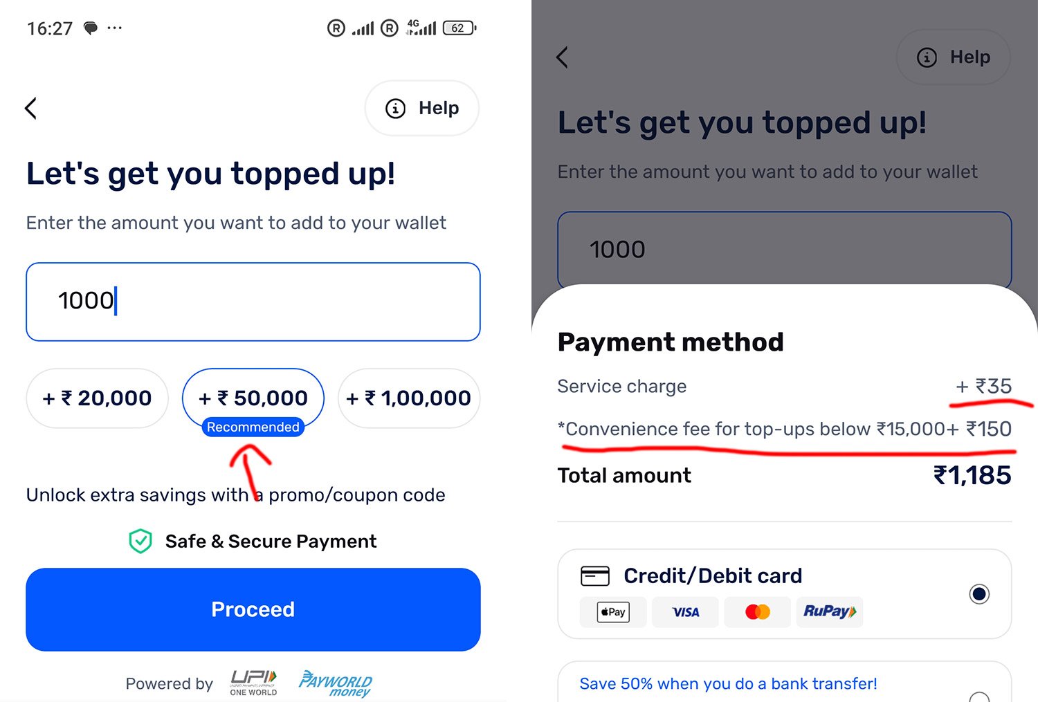 Monyの口座がアクティベートされたので、早速入金して使ってみます。こちらが入金の画面。VISAやMASTERが使えるみたいですね。入金してみようと思ったのですが、入金手数料がそれなりに高い事に気が付きます。サービスチャージが35Rsに、15000Rs以下の入金のサービスチャージが150Rs。合計で185Rsかかります。