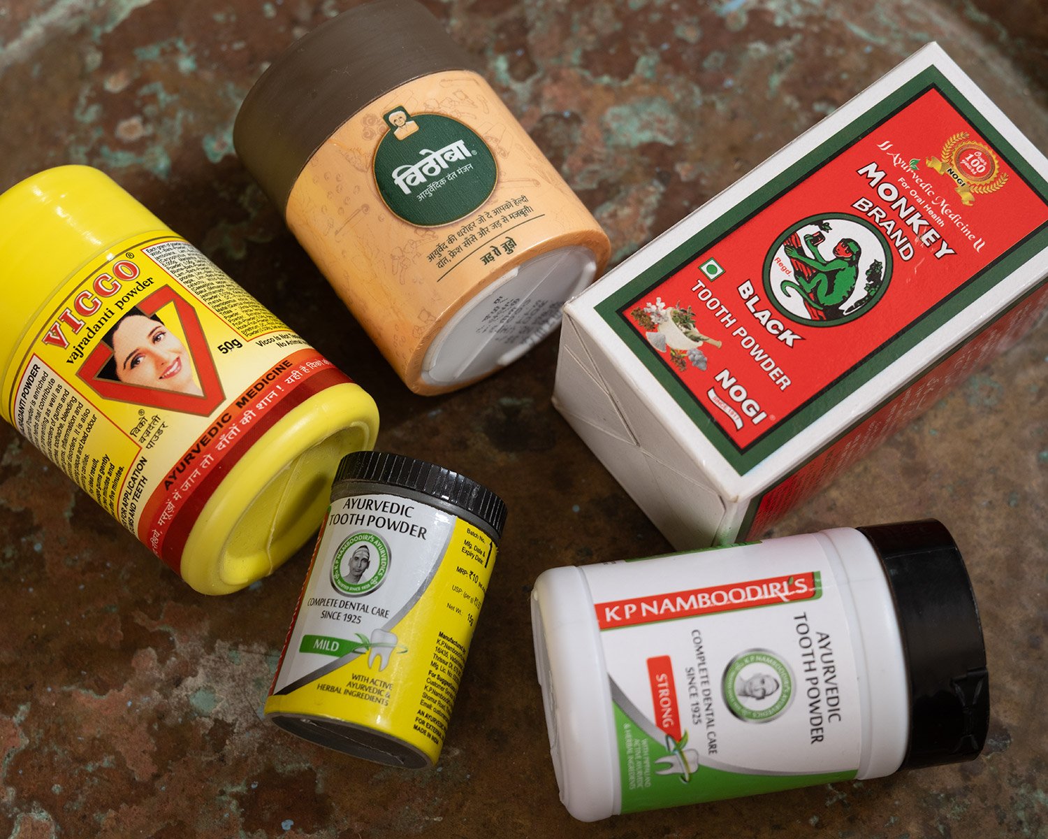 また、インドでは粉タイプの歯磨きも根強い人気があります。ニーム、クローブ、生姜などをブレンドしたハーブパウダーを歯ブラシにつけて、歯と歯茎をゴシゴシ。チューブ入りペーストに慣れている私たちからすると、「え、 粉で?」とびっくりしますが、南インドのアーユルヴェーダ薬局に行くと、普通に棚に並んでいます。