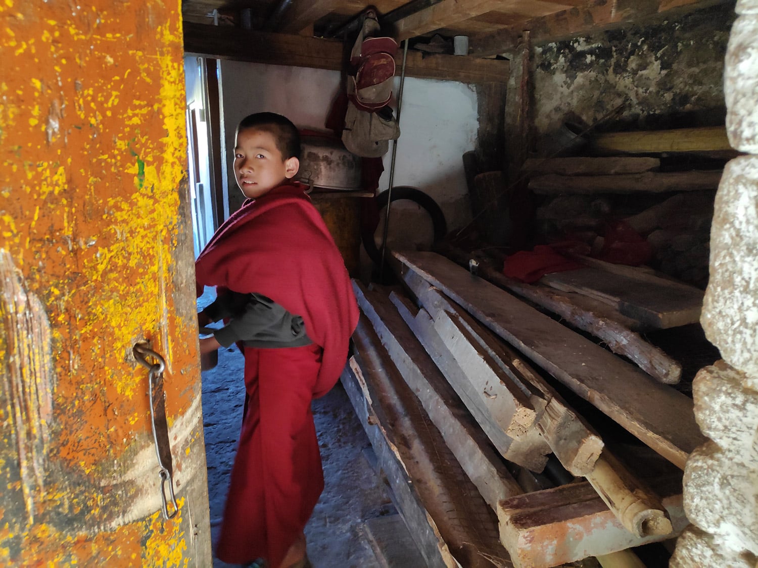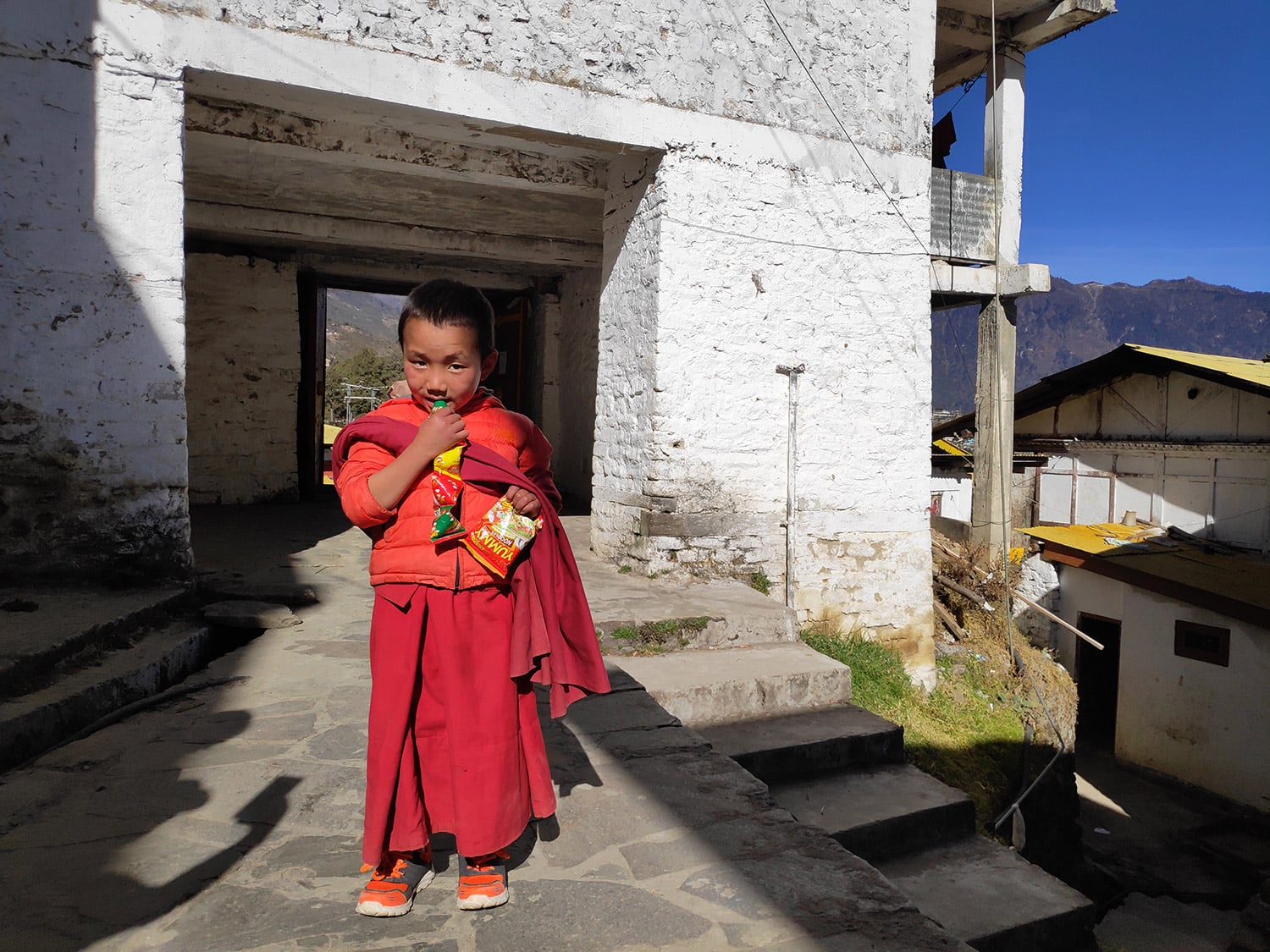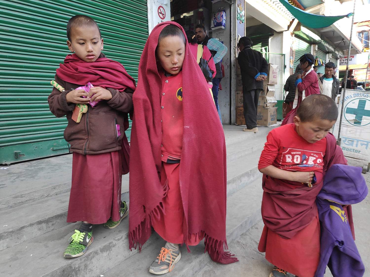 僧院の子供たちがおそろいの赤いショールを着ていました