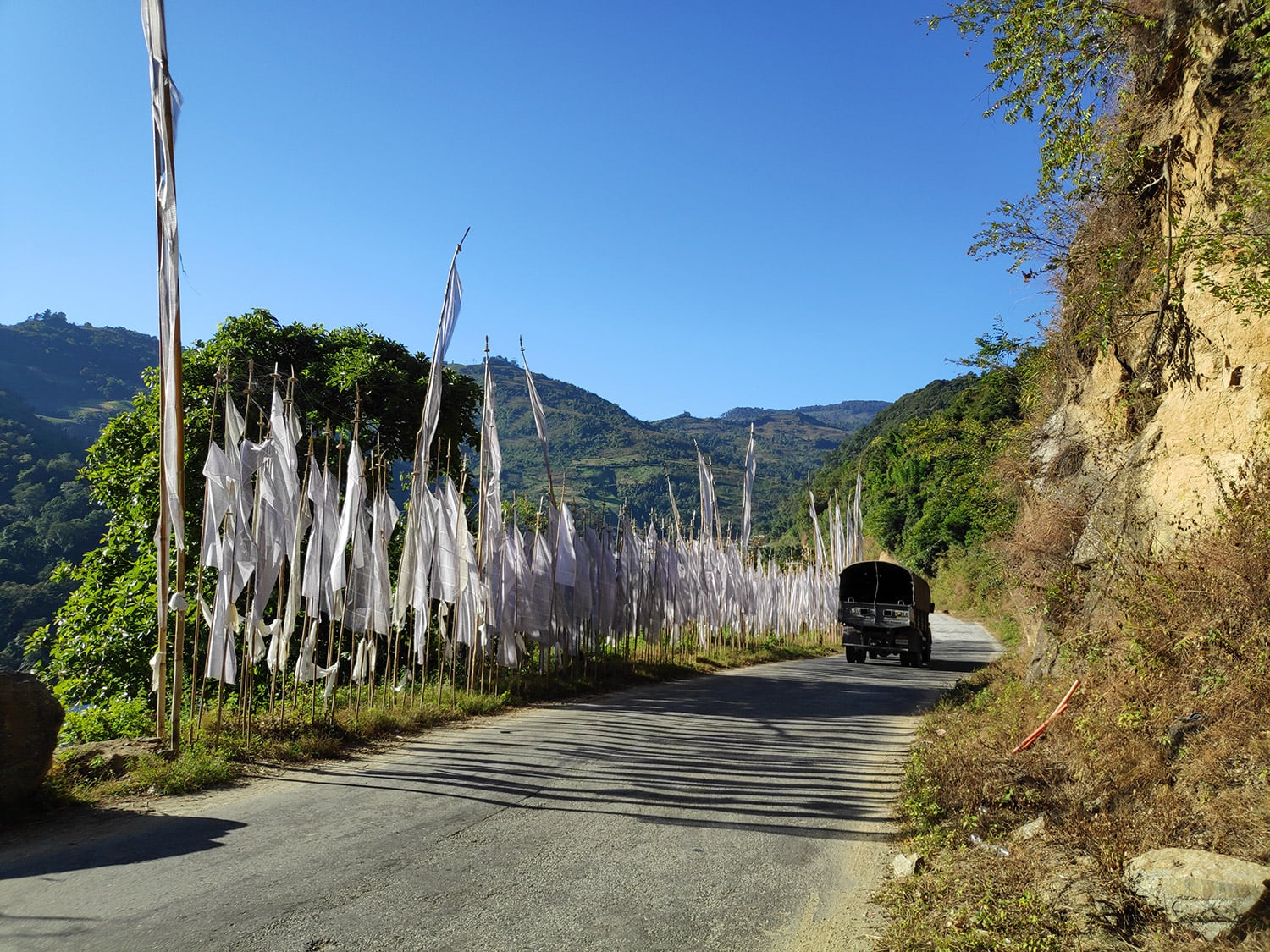 白いタルチョの横を軍用トラックが走っていました。タルチョーは普通5色の色をしているチベットの祈祷旗ですが、白いタルチョは非常に珍しいもの。この地域だけで使われてるような気がします。