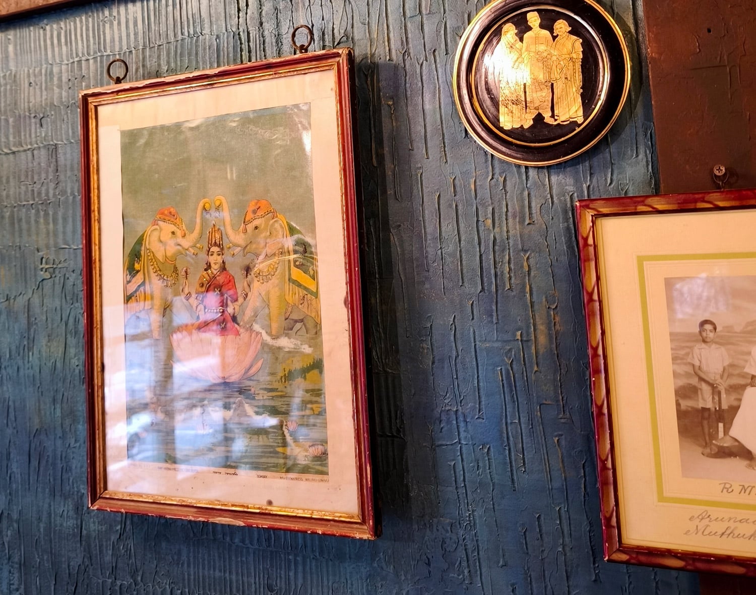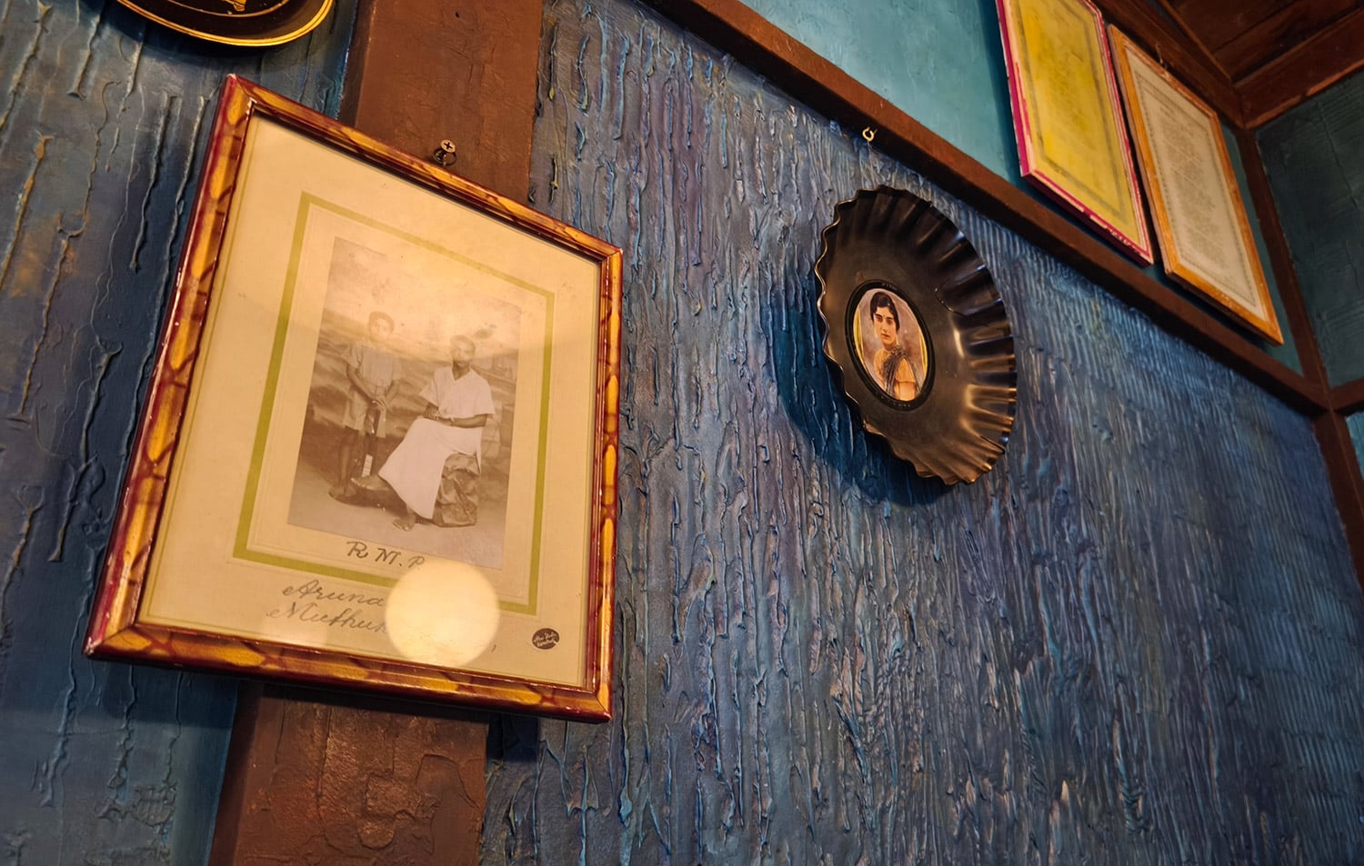 壁には古いレコードで作られたお皿と、古い白黒の写真が飾られています。どれも昔のインドの家にあったなぁ…と懐かしく思い出すものばかりです。