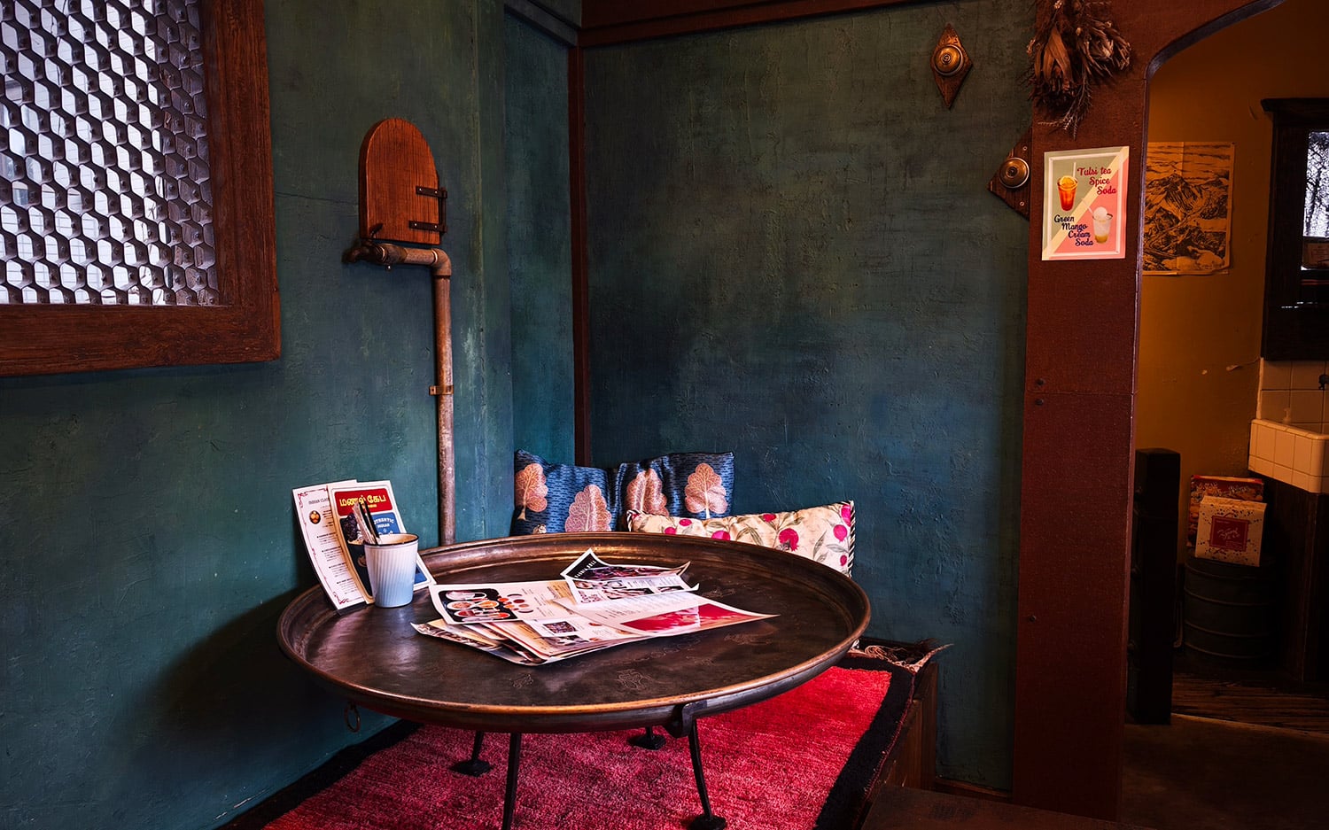 窓ガラスには格子がはめられ、クッションもインド柄。そして何と言っても丸い机が可愛い!!!