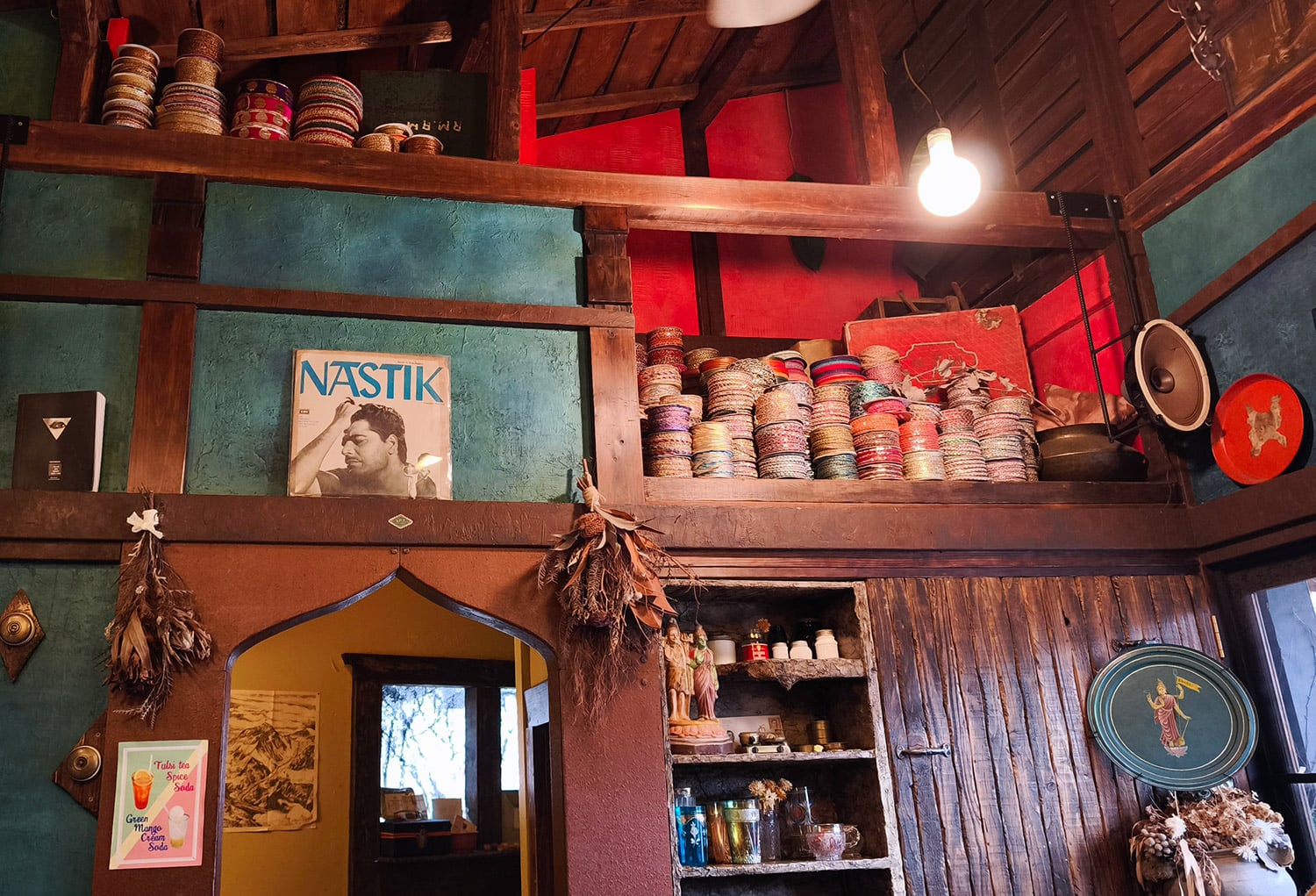 中に入ると、そこは丁寧にセレクトされた素敵なインドでした。壁の色はなんとも言えないオールドグリーン。古いインドのLPレコードが飾られ、棚の上には可愛らしいインドのチロリアンテープが置かれています。
