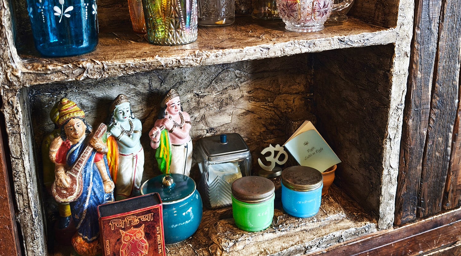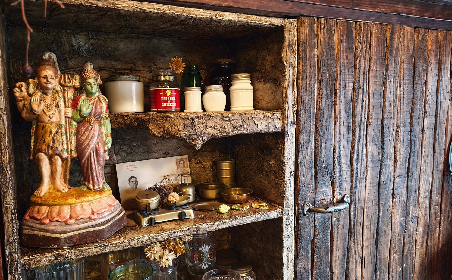 棚にはシヴァとミナクシの古い像。小さなインドのままごとセットに、古いポストカード。