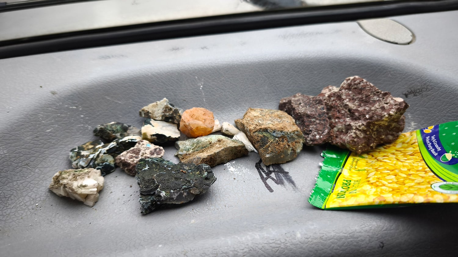 と言うわけで、今回は自分ではあまり大きなものを見つけられなかったので、現地コレクターの方から、この地方で発見されたカバンサイト、ゼオライト、メソライトをいくつか譲って頂きまして、持って帰ってきました。