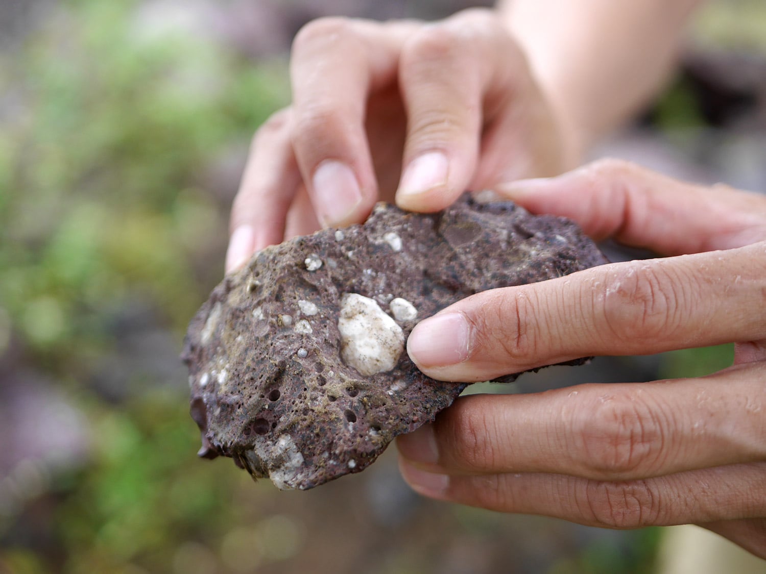 こちらがこの地域の岩の組成の一部分である「ゼオライト(沸石)」と呼ばれるもので、これから探すカバンサイトは、このゼオライトの近くで一緒に発見される青い鉱物なのです。